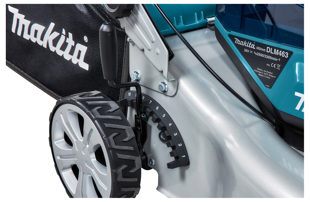 De MAKITA DLM463 accu grasmaaier is uitgerust met een robuust stalen maaidek met een maaibreedte van 46cm geschikt voor gazons van 800m2 tot 1600m2. De grasmaaier is voorzien van tien hoogte standen met een bereik van 20mm tot 75mm. een elektronische en een mechanische motorrem. Met de DLM460 is het mogelijk om te vangen in de vangbak met een capaciteit van 60 liter en te mulchen met de standaard bijgeleverde mulchplug. Tijdens het maaien zorgt de waaierschijf onder het maaidek voor een goede luchtcirculatie wat er voor zorgt dat het gras netjes in de vangbak terecht komt. Het voordeel van een accu grasmaaier ten opzichte van een benzine grasmaaier is dat hij stiller. goedkoper en schoner is. Het voordeel ten opzichte van een elektrische grasmaaier is dat je geen snoer hebt en dus geen beperking in bewegingsvrijheid. Bij gebruik van twee 6.0 Ah accu's heeft deze machine een gemiddelde standtijd van 21 minuten.Uitgerust met soft no load (automaatstand): de toeren stijgen automatisch wanneer de weerstand toeneemt.